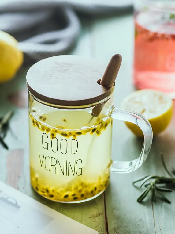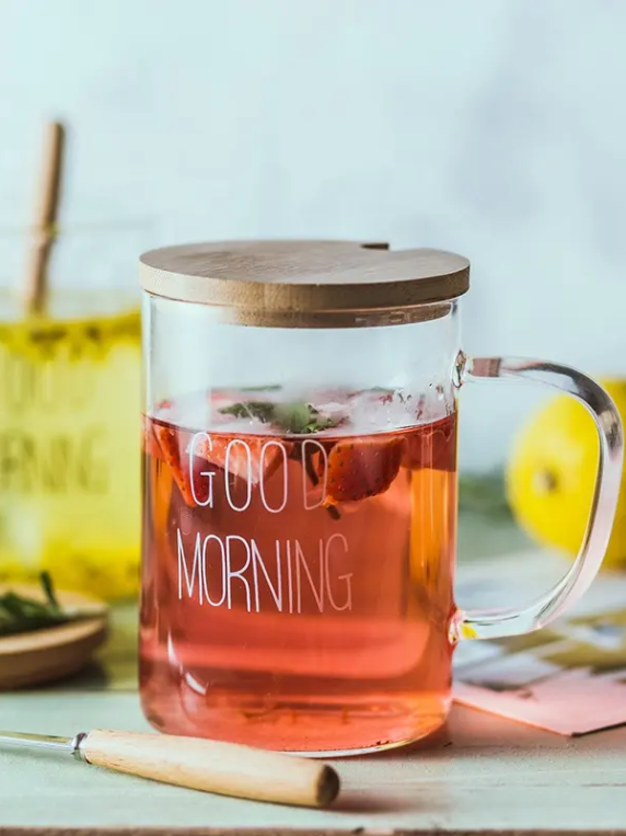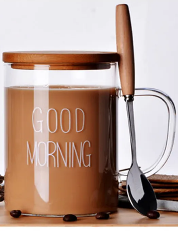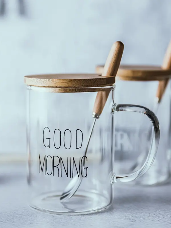 Our Glass Mug Set is a heat-resistant breakfast and coffee glass mug (15 oz.) with a bamboo lid and spoon