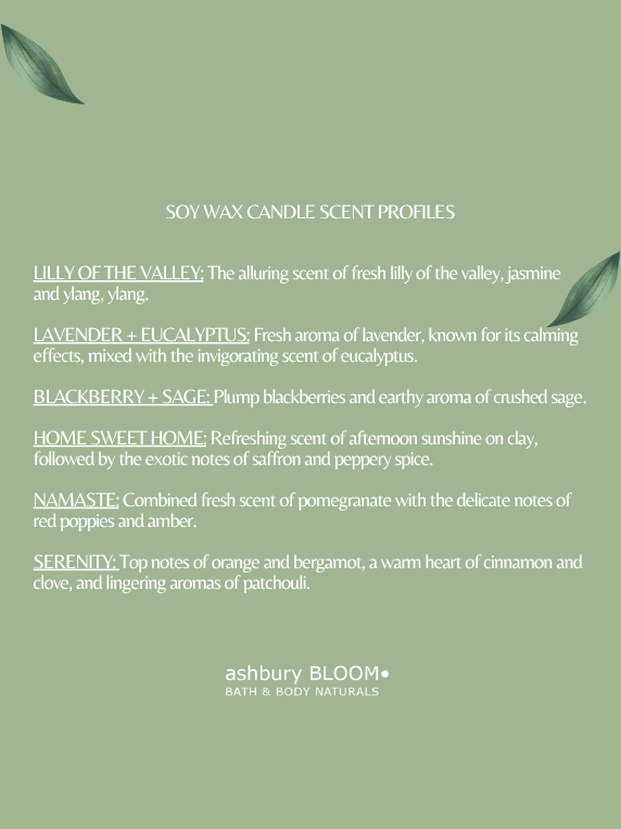 | Scent | Serenity, Namaste, Lilly of the Valley, Lavender + Eucalyptus, Home Sweet Home, Blackberry + Sage |