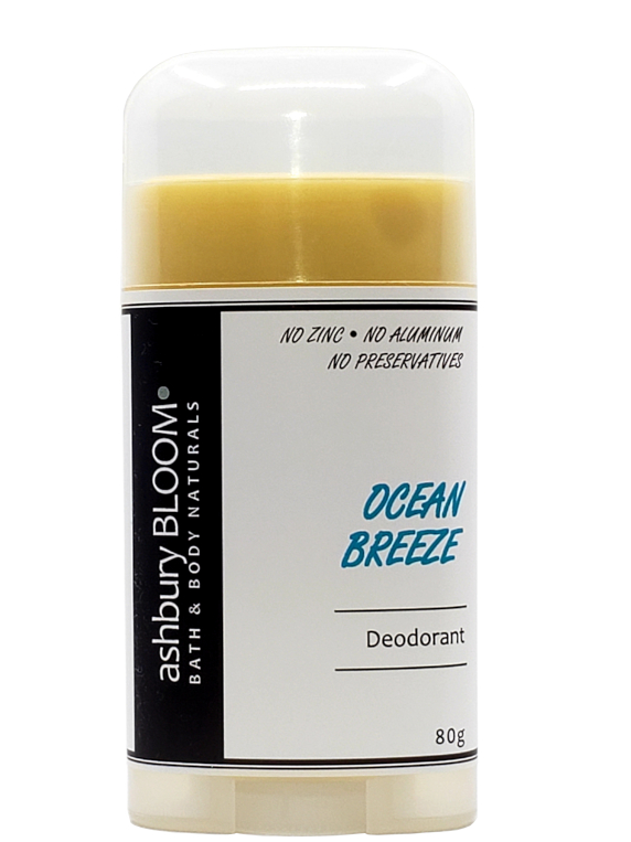 The Ocean Breeze Deodorant is made with Coconut Oil, Shea Butter, Beeswax, Arrowroot Powder, Baking Soda, Fragrance Oil