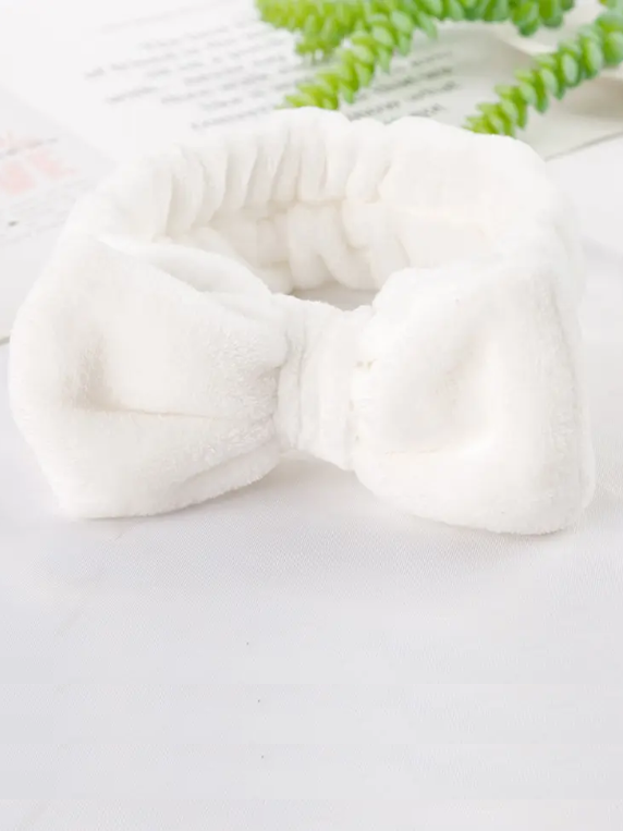 Adult size white soft fleece Spa Headband with removable bow. Ultimate accessory for wrapping back your hair when pampering, cleansing, masking, or simply applying make-up.